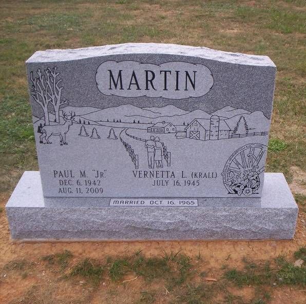 Memorials come in all shapes a colors. They can be sandblasted or etched. Etchings can be either black and white or colored. Etchings can be standard or custom. For example we can put an etching on a Memorial of your farm, house, car, cabin, whatever you desire. Black Granite stones are made to be etched. Etchings can now be done on Pink and Green also. Gray and other colors are usually sandblast designs. Etchings can and will fade over some period of time.